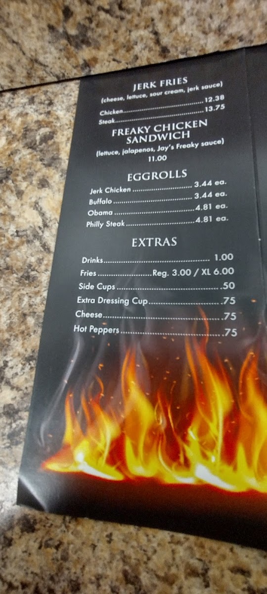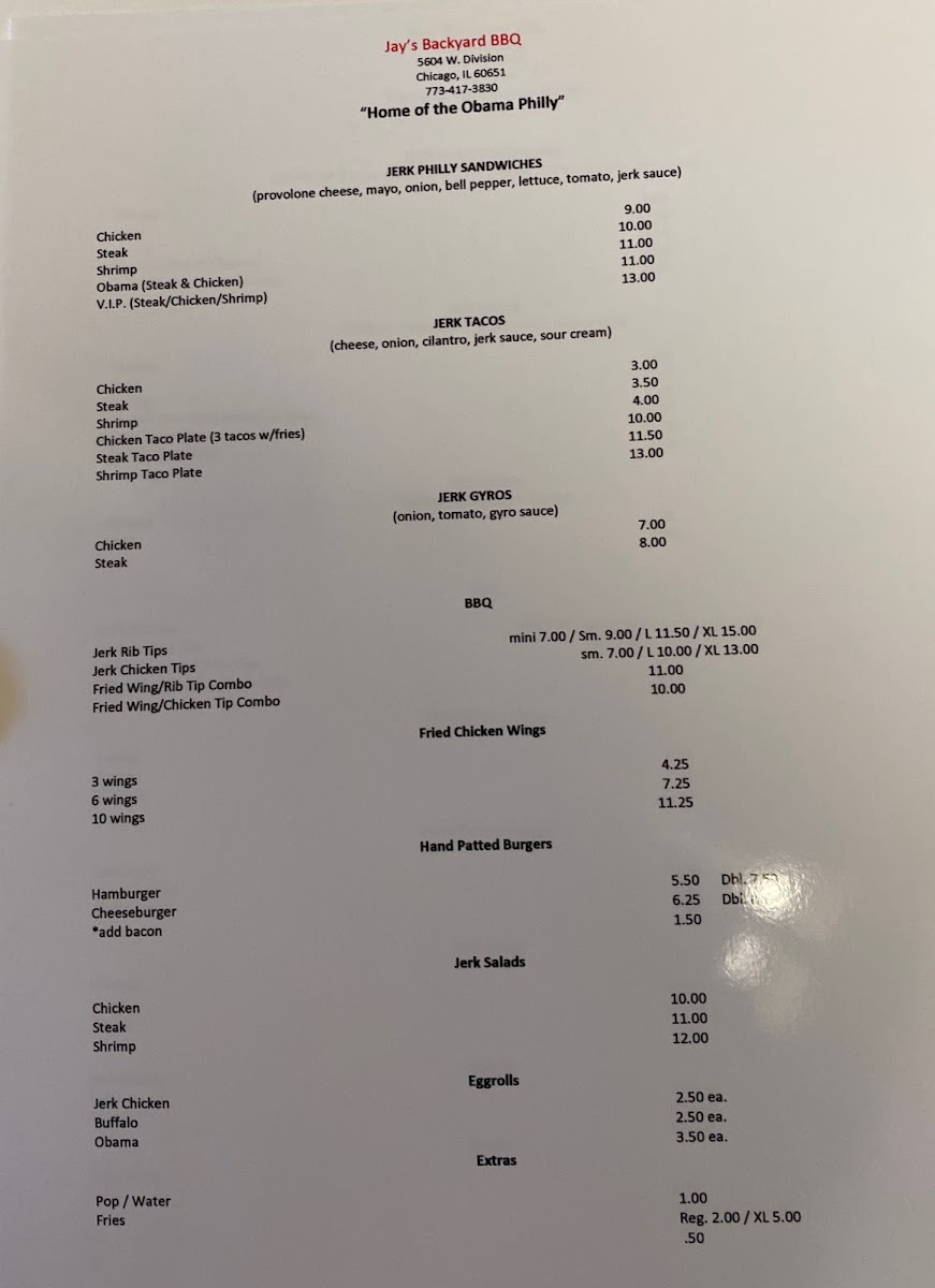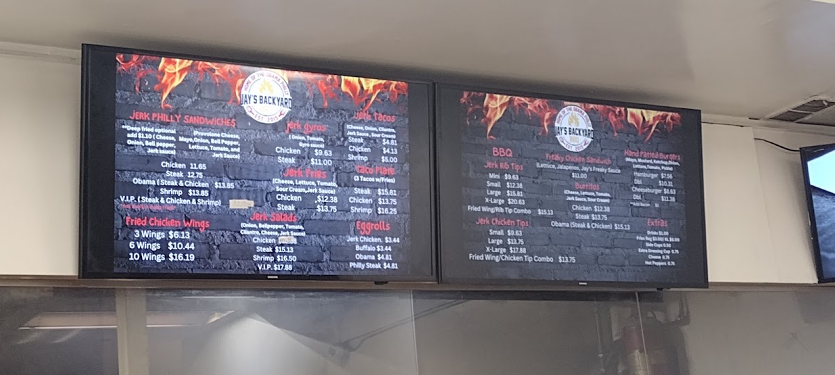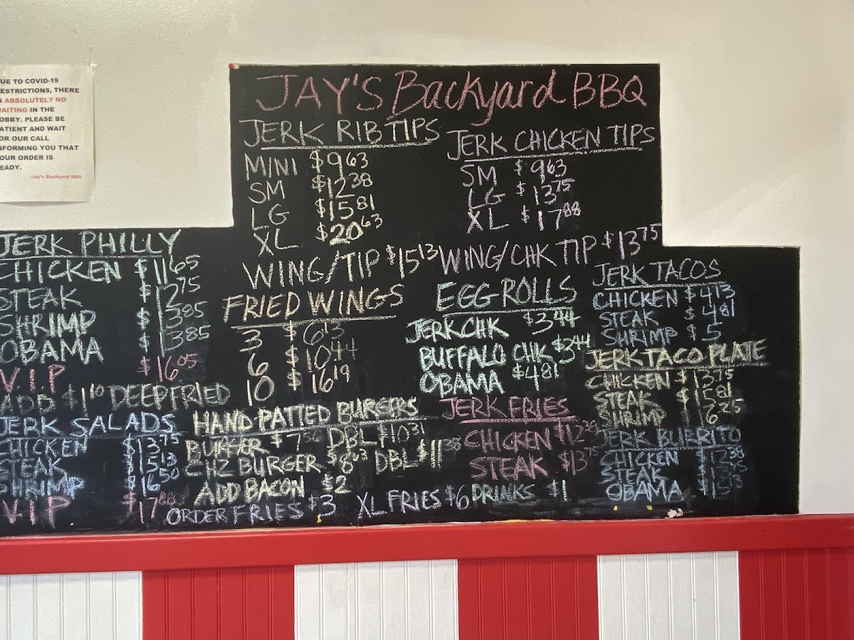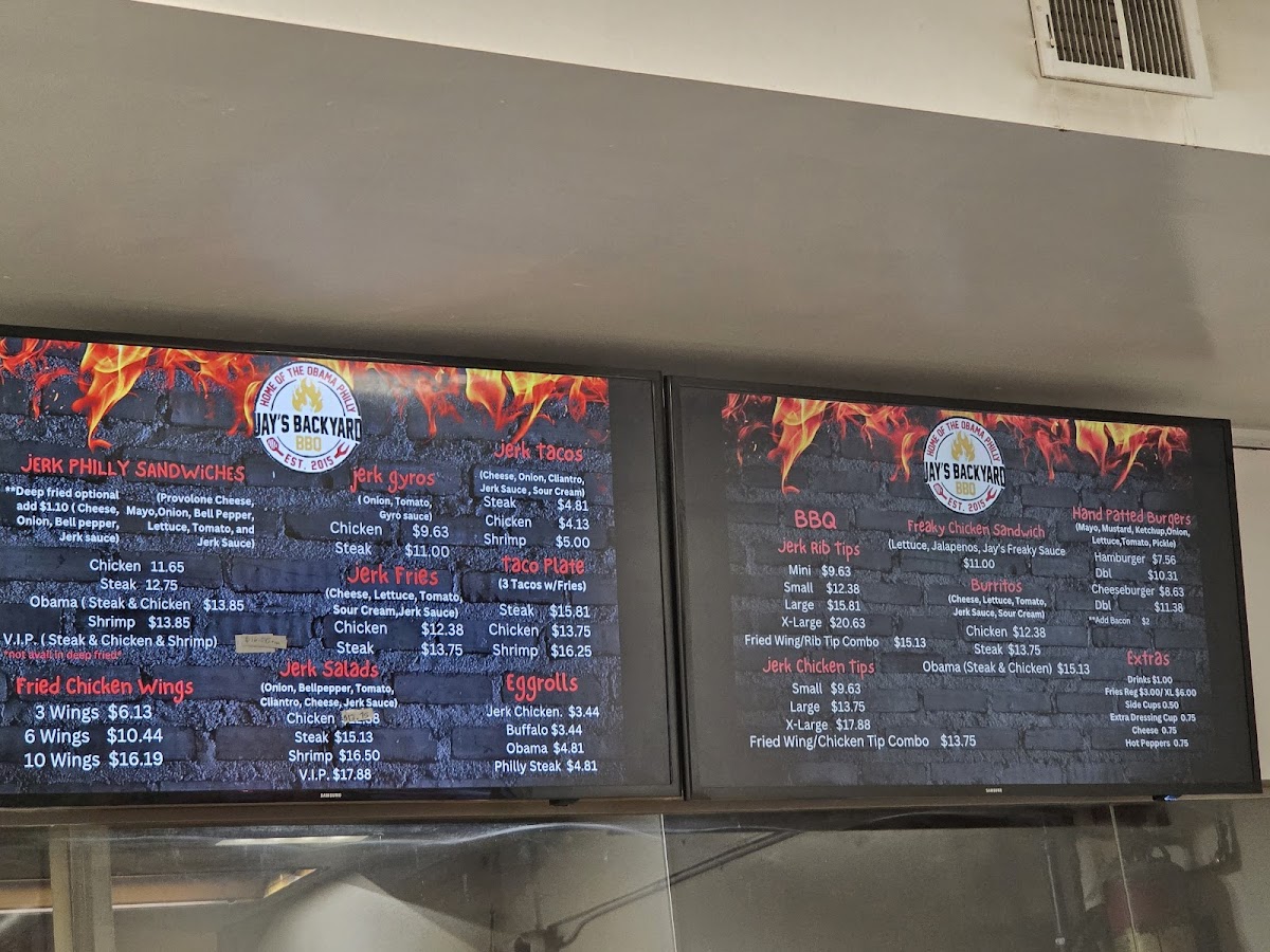 Jay's Backyard BBQ offers a straightforward, casual menu built around hearty barbecue flavors with a distinctive jerk twist. Expect a variety of satisfying options that fit perfectly into relaxed lunch breaks, weekend dinners, or casual gatherings with friends and family. The menu features specialties like Jerk Rib Tips, Jerk Chicken Gyros, and creative takes such as the Obama Philly and Jerk Egg Rolls — each bringing a comforting blend of spice and smoky barbecue goodness.